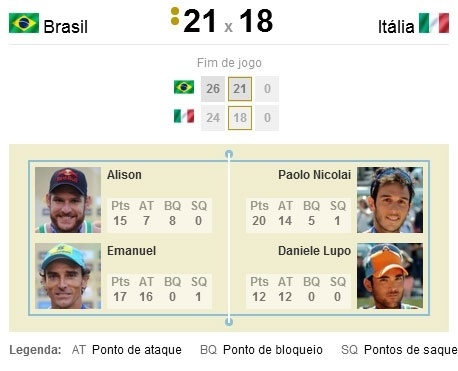 Atrás durante toda a parcial, virada do Brasil veio somente nos momentos decisivos. Depois de dois erros italianos, Alison e Emanuel passaram à frente para marcar 19 a 18. O equilíbrio, no entanto, se manteve e os brasileiros só conseguiram fechar em 26 a 24 com bons bloqueios de Alison.